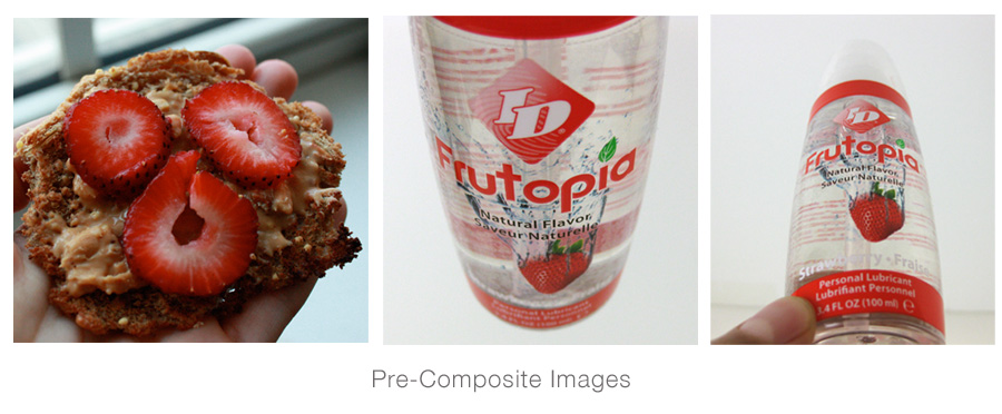 I came up with the concept of having the bottle split open to reveal fruit inside. This was a visually compelling way to convey that the product was naturally fruit flavored. I also photographed the bottles, composited the images, and designed the advertisement.